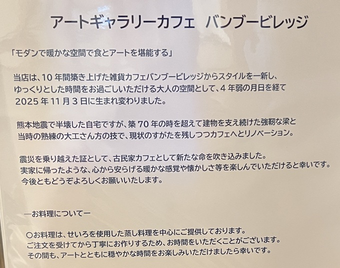 残念で仕方なかったのですが、今回4年弱の月日を経て2025年11月3日【アートギャラリーカフェ バンブービレッジ】としてバンブーさんの第二章が始まりました!!